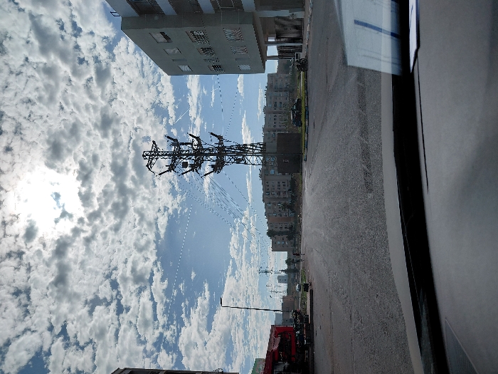 The image, taken from within a vehicle, depicts an urban landscape in Mohammedia, Morocco, under a sky with extensive stratocumulus clouds and a visible sun in the upper center. In the midground, a prominent, dark metal electricity transmission tower with multiple arms stands slightly left of the central axis. Numerous power lines extend from the tower into the surrounding sky. The foreground features a wide, paved asphalt road. On the left side, a section of a building is partially visible, followed by a red truck, possibly a flatbed, parked or stationary. Further along the left, a street light pole is present. Two indistinct human figures are walking on the left side of the road in the mid-distance. On the right side of the road, a multi-story building with a light-colored facade and multiple rectangular windows occupies the midground. The building's ground level appears open with supporting columns. A dark-colored motorcycle or scooter is parked near this structure. In the background, a cluster of multi-story residential apartment buildings is visible. A small, dark structure is situated at the base of the central transmission tower, and a dark-colored car is visible further down the road toward the background buildings. Additional, smaller transmission structures are discernible in the far distance.