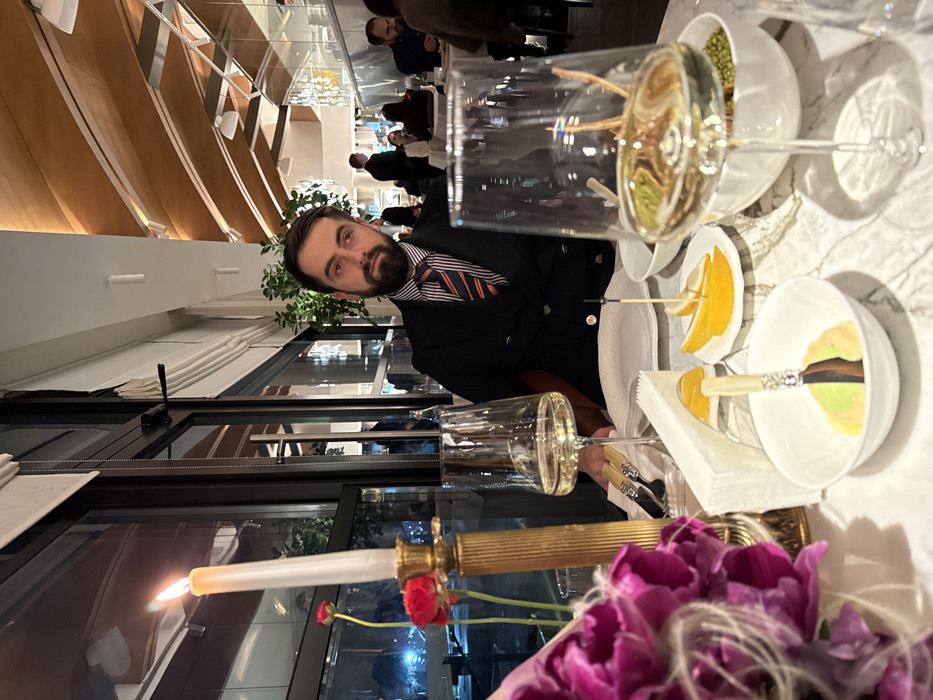 The image depicts an evening dining scene inside an upscale restaurant identified as Sherep Restaurant, located at Amiryan St 1, Yerevan, Armenia. In the foreground, a white marble-patterned table is set. On the table, from left to right, a partially visible bouquet of purple flowers, a golden candelabra holding a lit white taper candle, and a small arrangement of red flowers are present. Two clear stemmed wine glasses containing pale yellow liquid are visible, one in sharp focus to the left, the other slightly blurred to the right. A white square napkin dispenser, a small white plate with three lemon wedges, and a small white bowl containing a multi-layered spread (pale green, beige, dark brown) with a decorative knife inserted are also on the table. Another small white bowl with green elements is visible to the right. An empty white plate and cutlery are positioned to the right of the candle. The central subject is a man with a dark beard and dark hair, wearing a dark double-breasted suit jacket over a light shirt and a striped tie (orange, blue, white). He is seated at the table, looking directly towards the camera. The background reveals large, dark-framed glass windows on the left, looking out onto a dark exterior with blurred lights, consistent with nighttime in a city. The interior features a distinctive modern ceiling composed of light-colored wooden panels and beams, with recessed lighting and strip lights illuminating the space. Other patrons are seated at tables in the mid-ground and background, appearing somewhat indistinct. A server or staff member in dark attire is also visible in the background. Potted green plants are strategically placed throughout the restaurant, contributing to a sophisticated and warm ambiance.