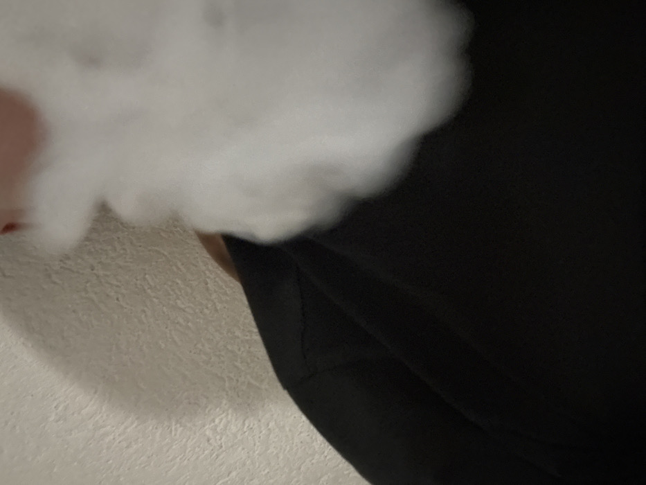 The scene depicts a close-up, overhead view of an individual indoors, partially obscured by a dense, white plume of vapor or smoke. The subject is wearing a dark, possibly black, short-sleeved garment, visible across the mid-section of the image. A small portion of the subject's head, including what appears to be light-toned skin and potentially an ear, is visible in the upper left quadrant, near the wall. The prominent white plume originates from the lower right and expands upwards, dominating the right and central areas of the frame, suggesting an act of exhalation or emission. The background consists of an off-white or light beige textured wall, possibly plaster or stucco, visible in the upper left. A subtle shadow is cast on this wall, indicating an interior light source. No specific identifiers are present in the image to determine a precise location within Birkova, Bulgaria, beyond an inferred indoor setting.