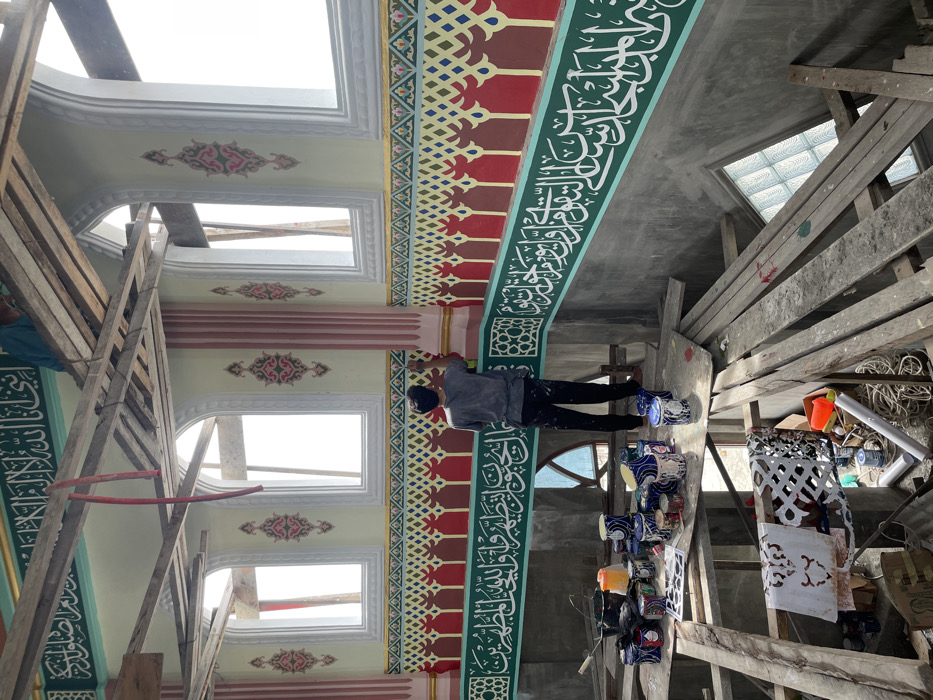 The interior of a building, likely a mosque, in Mns Asan, Indonesia, is depicted under active decoration. A male individual, seen from behind, stands on a wooden platform, painting intricate patterns onto a wall section with a brush. He wears a grey shirt and dark trousers. Numerous paint cans, brushes, and stencils are arranged on a wooden platform to his left. A second individual is partially visible on higher wooden scaffolding in the upper right background. The walls feature elaborate Islamic calligraphy in white script on a prominent green band, extending horizontally across the room. Above this, a decorative frieze combines red, gold, and white geometric and stylized floral motifs. Pale yellow walls ascend to the ceiling, punctuated by multiple tall, arched windows that are currently open, allowing bright daylight to enter. Pinkish-red pilasters or columns flank some window sections, which are also adorned with smaller, intricate decorative patterns. Extensive temporary wooden scaffolding structures crisscross the space, supporting both workers and materials. The lower wall section below the finished decoration is unfinished grey concrete. A smaller, arched window with a glass block infill is visible in the lower right background. Overhead, a red flexible tube hangs from the wooden ceiling structure.