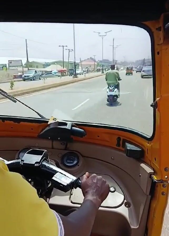 view from inside a yellow auto rickshaw or tuk-tuk moving along a road. The driver, wearing a yellow shirt, has his hand on the steering bar. Through the windshield, other vehicles, including a scooter and cars, can be seen on the road. There are streetlights and some buildings visible in the background under a bright sky. The road has painted lane markings.