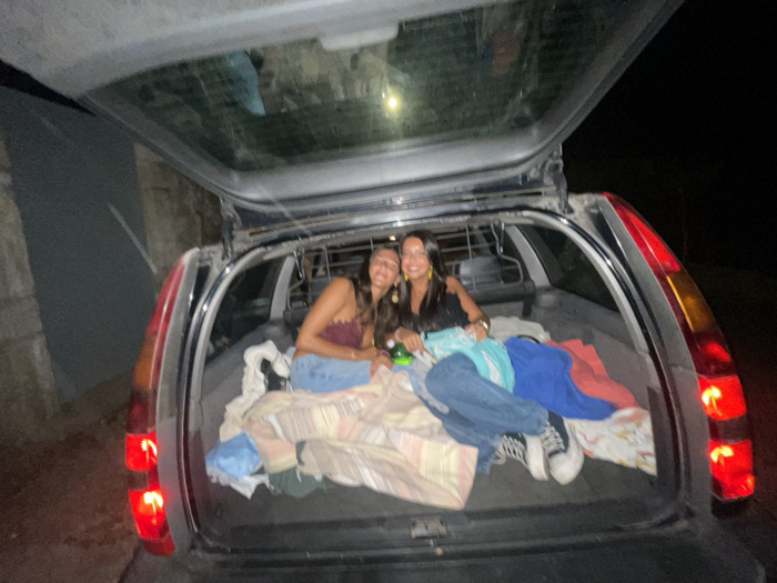 This image captures a nighttime scene in Vila Nova de Cerveira, Portugal, showing the rear of a dark-colored station wagon or hatchback vehicle with its trunk lid open and elevated. Two young adult females are seated inside the vehicle's trunk compartment, which is extensively lined with various folded blankets or clothing items in patterns and solid colors including beige, pink, blue, red, and white. The female on the left wears a dark reddish/burgundy strapless top and light blue jeans; she is smiling and looking towards the camera. The female on the right wears a black top, light blue jeans, black-and-white sneakers, and yellow hoop earrings; she is also smiling towards the camera and holds a green bottle in her right hand. Both individuals appear relaxed and are positioned on the accumulated fabrics within the trunk. The vehicle's red taillights are illuminated. In the background on the left, a dark, textured wall or building structure is visible, likely stone or concrete. The area immediately surrounding the vehicle and extending to the right is largely dark and unlit, suggesting an outdoor, possibly remote or minimally illuminated setting at night. Reflections of an internal light source, likely the camera flash, are visible on the vehicle's rear window and the underside of the open trunk lid.