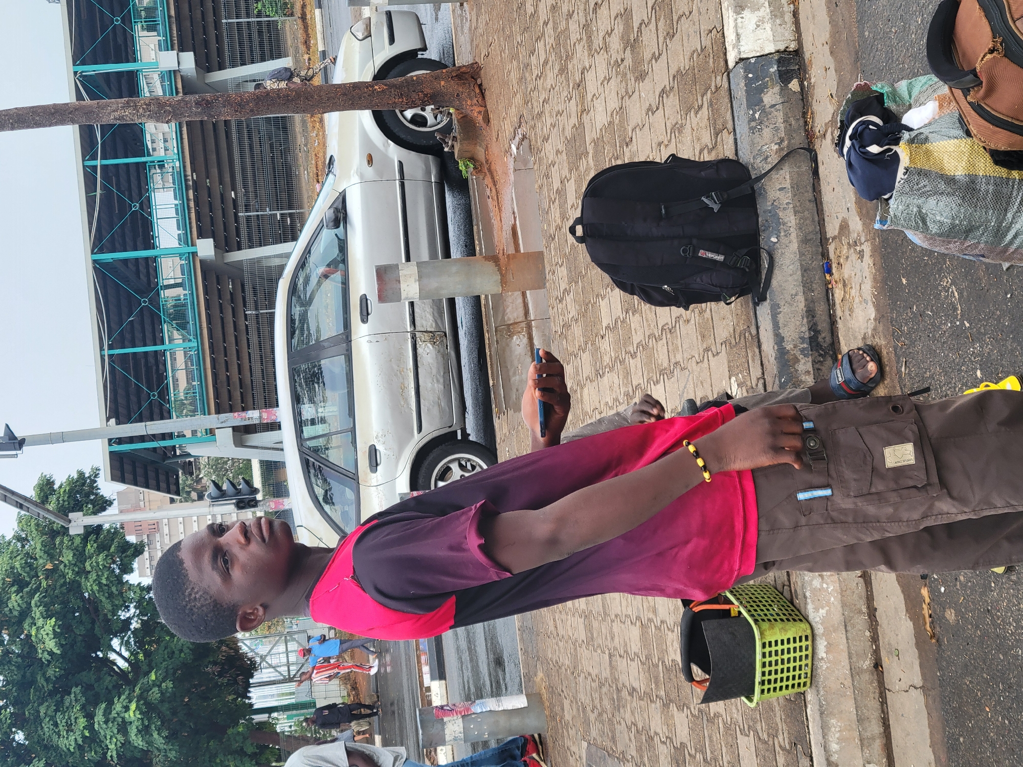 A young Black man stands on a paved sidewalk in Abuja, Nigeria. He is looking off into the distance, holding a smartphone. He wears a red and black shirt, brown cargo pants, and a beaded bracelet. Beside him on the ground are a black backpack, a green plastic basket, and other bags. A silver car is parked at the curb next to a metal pole. Behind the car is an elevated pedestrian walkway. A traffic signal is visible in the background.