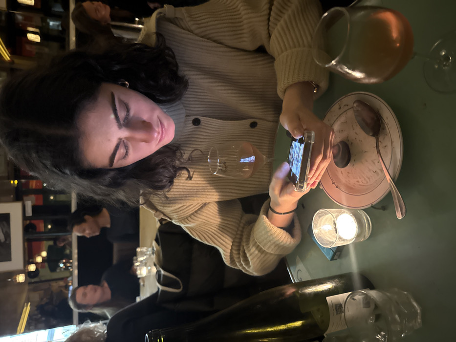 A dark-haired woman, seated at a table, uses her smartphone to photograph a dirty plate with a spoon on it. A half-empty glass of rose wine sits beside the plate. A lit candle and a wine bottle are also on the table. Other people are seated in the background. The lighting is subdued, suggesting an intimate dining setting.