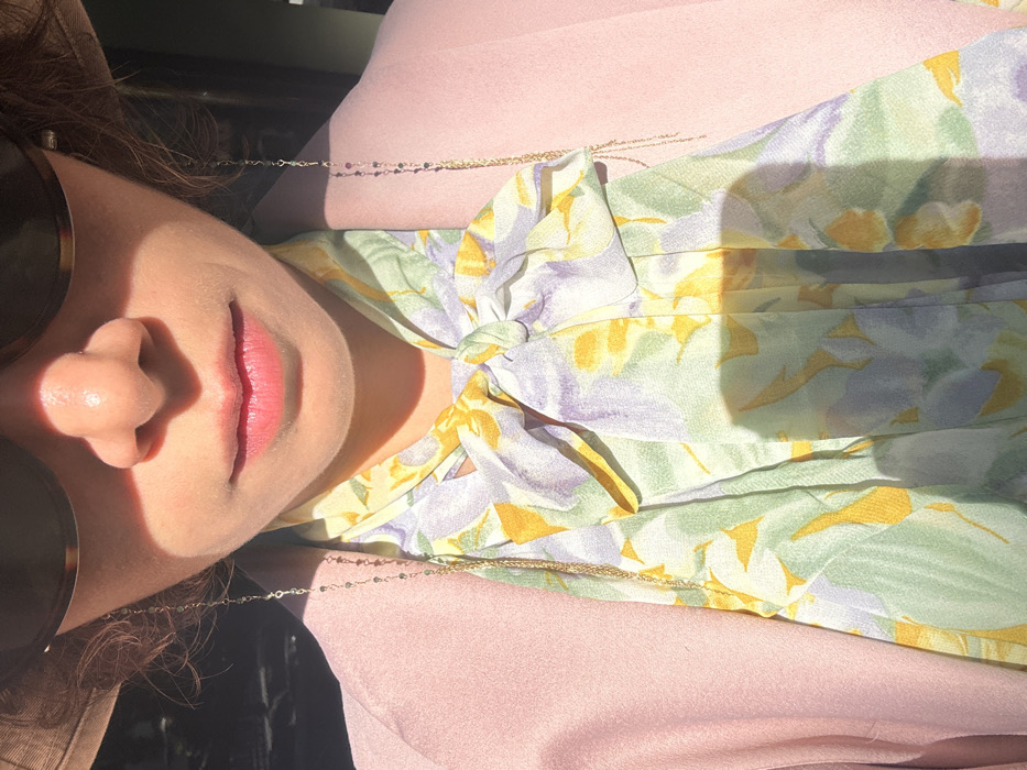 A person wearing sunglasses poses, facing the light, revealing details of their nose and lips. The individual is dressed in a pink outfit, layered with a floral scarf knotted at the front, predominantly featuring yellow and lavender hues. A delicate, double-strand necklace with small stones adorns the neckline. Shadows play across the face and clothing, highlighting textures and shapes.