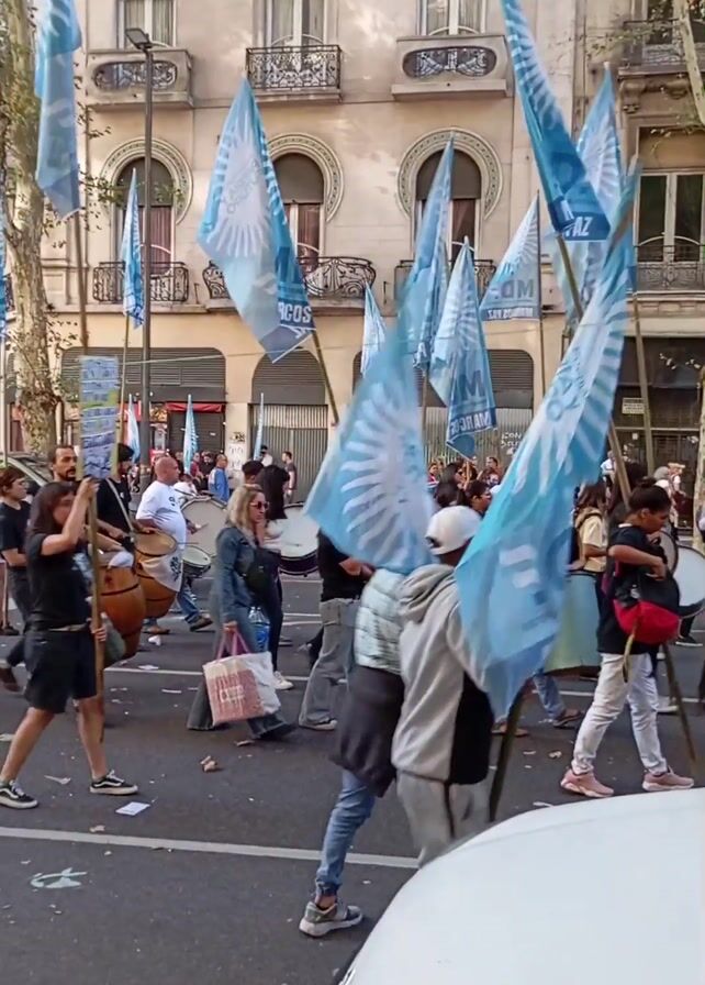 A group of people is marching down a city street. Many are carrying light blue and white flags on bamboo sticks. Some people are playing drums. There are buildings on both sides of the street. A white car is parked on the right side of the street in the foreground. There are also red banners being carried in the march further ahead. People walk along the sidewalks as well.