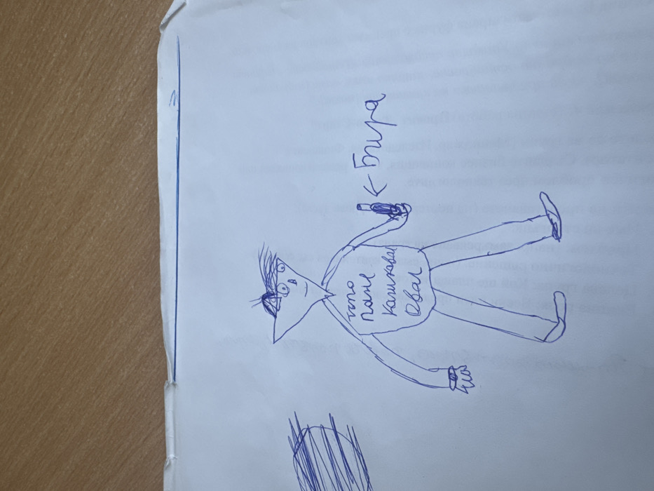 - "The image displays a child's drawing, executed in blue ink on a sheet of white paper, positioned on a light brown wooden surface" by FM-me4xL2, licensed under CC BY 4.0