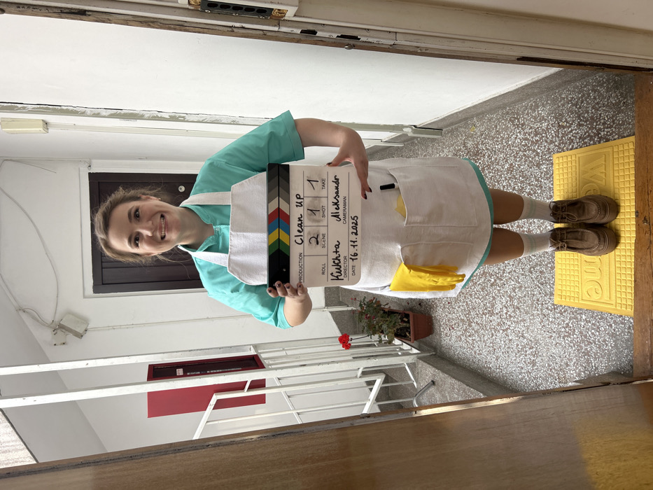 A female individual, estimated to be in her 20s to 30s, stands smiling and centered in an interior residential hallway in Vozdovac Urban Municipality, Serbia. She is attired in a light teal uniform shirt, a white apron with light teal trim, white knee-high socks, and brown platform lace-up shoes. The apron's left pocket contains a yellow rubber glove, and its right pocket holds a black marker and a yellow sponge. She grasps a black and white clapperboard with both hands, which displays the text: "PRODUCTION: Clean up", "ROLL: 2", "SCENE: 1", "SHOT: 1", "DIRECTOR: Kukhta", "CAMERAMAN: Aleksandar", and "DATE: 16.11.2023". She stands on a yellow rectangular doormat, positioned on a light grey speckled terrazzo floor. To her left, a white metal stair railing is visible, behind which a red fire extinguisher cabinet and a brown potted plant with red flowers are situated. A dark brown residential door is visible further down the hallway in the background, against white walls. The scene captures a moment during a film production.