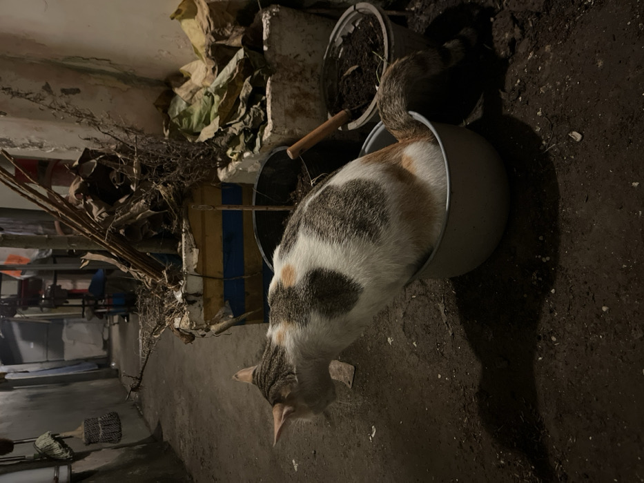 A cat with a white, orange, and gray spotted coat has its head deep inside a large, light-colored bucket or pot. The pot sits on a dark, dirt-covered surface. Behind the pot is a cluttered area with various objects, including buckets, plants, sticks, and potentially some construction materials. The background is dimly lit, making the details somewhat obscured. The overall impression is of an enclosed, possibly outdoor storage or work area.