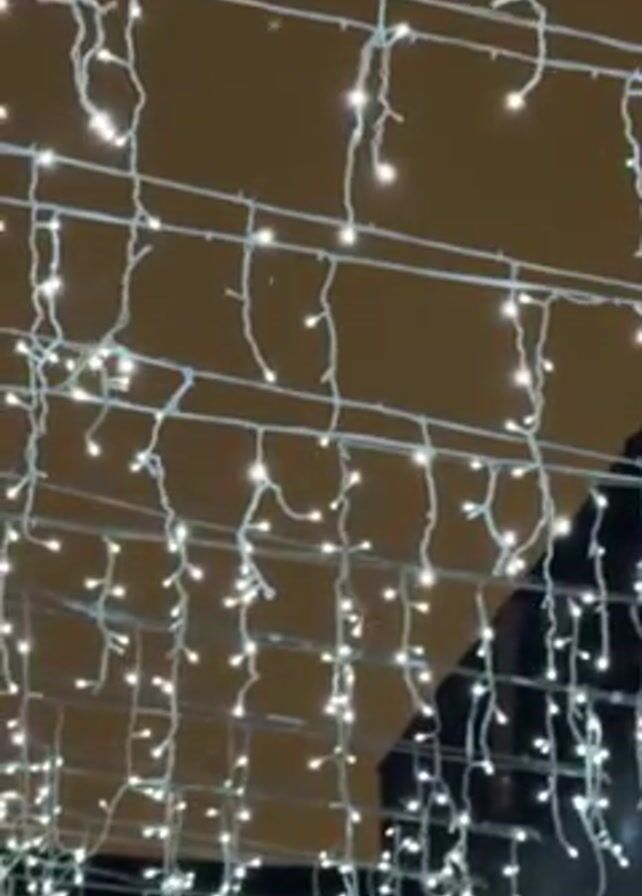 string of white holiday lights hanging in an outdoor setting. The lights are strung horizontally with vertical dangling segments, resembling icicles. Behind the lights, a blurred building facade is visible. The overall impression is festive and decorative, likely taken at night or in dim light. Unintelligible chatter can be heard.