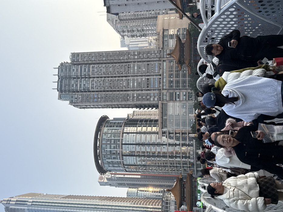 The image depicts a bustling urban scene in Yuzhong District, Chongqing, China, on a clear day with a light blue sky. The background is dominated by modern high-rise buildings. On the far left, a tall, slender skyscraper with a reflective facade extends vertically out of the frame. To its right, a distinctive multi-story circular building with a glass exterior prominently features a "重庆银行" (Chongqing Bank) sign on its lower section. To the right of the circular structure stands a tall, rectangular building characterized by numerous visible windows and balconies. Several other high-rise buildings are visible further in the background. Below the modern structures, two traditional Chinese-style pavilions with dark, tiered roofs and red architectural details are situated, integrated into the urban environment. The foreground and midground are occupied by a dense crowd of pedestrians on a grey or white elevated walkway, identifiable by its decorative, wave-patterned railings. The individuals, primarily adults, are dressed in casual, cool-weather attire, including puffer jackets, hoodies, and coats. Many individuals are engaged with mobile phones, either holding them or looking at their screens. People are walking in various directions along the crowded pathway. Notable individuals include a woman on the far left in a white puffer jacket and glasses, a woman in the central foreground wearing a black coat and glasses while holding a phone, and a man on the right in a black jacket who is focused on his phone.