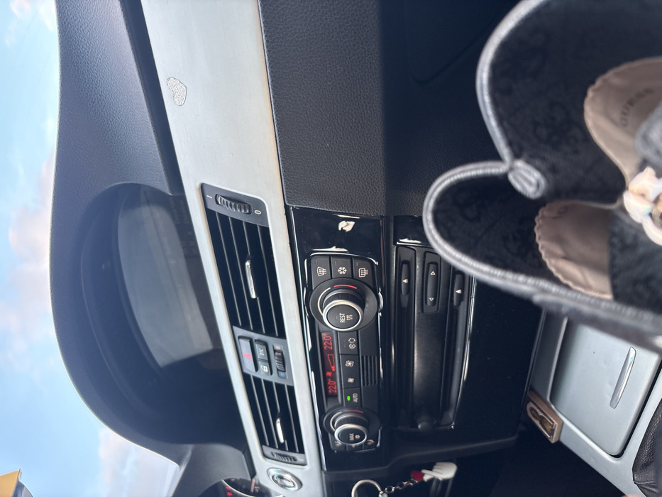 The image depicts the interior of a vehicle, specifically focusing on the passenger side dashboard and center console. The dashboard is primarily dark grey/black textured plastic, with a horizontal silver trim panel extending across the passenger side and center. A small, glittery, silver heart-shaped sticker is affixed to the silver trim panel above the glove compartment. The center console features two horizontal air conditioning vents with chrome accents, below which is a panel containing hazard light buttons and other controls. Beneath this, the climate control unit displays "22.0°" on both the driver and passenger side settings, with "AUTO" illuminated in green. Two large rotary knobs for temperature and fan speed, along with smaller buttons for various climate functions, are visible. The panel below the climate control unit appears to be a radio or media control unit with several smaller buttons and a slot for media insertion. This entire central section is framed by a glossy black trim. To the left, a keyring with a white charm resembling a hand making a "finger heart" gesture is suspended. In the foreground, out of focus, a black object resembling a purse or bag, possibly a shoe, is partially visible. The interior lining of this object displays a pattern that includes the word "GUESS." The background, visible through the windshield, shows a clear blue sky with some scattered white clouds, indicating daylight conditions. The specific city of Pernik, Bulgaria, cannot be confirmed from the visual evidence within the vehicle interior.