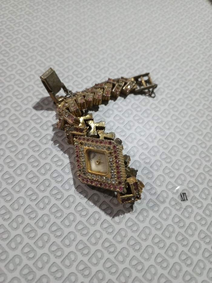 - "In the city of Phakeo, Laos, a gold-toned decorative wristwatch is positioned on a light grey surface featuring a repeating pattern of interlocking 'B' shapes" by FM-Eg5TQ2, licensed under CC BY 4.0