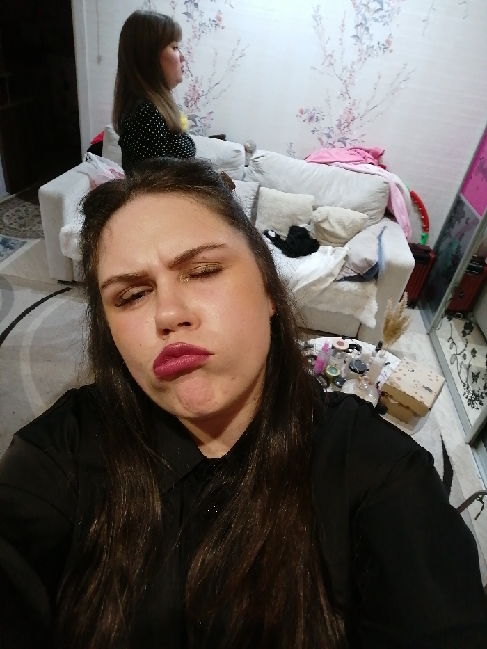 This image, captured in an indoor setting in Chaikovsky, Russia, features two adult females. In the foreground, a woman with long, dark brown hair, wearing a black collared shirt, directly faces the camera with a "pout" expression: her lips are pursed and coated with dark red lipstick, her eyebrows are furrowed, and her eyes are partially closed, with golden eyeshadow visible on her right eyelid. Behind her, a second woman with medium brown hair and bangs is seated on a light-colored, upholstered sofa, facing right in profile with her arms crossed. She wears a dark top with white polka dots. The sofa appears disheveled, covered with cushions and several articles of clothing, including a pink top and a white shirt. The wall behind the sofa is adorned with light-toned wallpaper featuring a pattern of dark branches and pink blossoms. To the right of the foreground subject, a small surface, possibly a table, displays an array of cosmetic products, brushes, and a decorative element resembling dried pampas grass. A partial view of a dark-framed mirror is visible on the far right, reflecting parts of the room. The floor is covered by a patterned rug with concentric circles in shades of white, grey, and black.