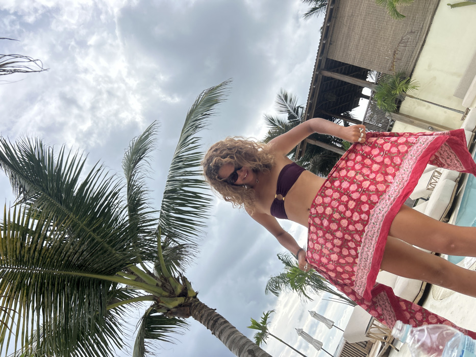 An outdoor scene in Kathaluwa, Sri Lanka, is depicted from a low angle under an overcast sky. A female individual, positioned in the lower center, faces the viewer, her head slightly tilted down. She possesses curly, light-colored hair and wears dark sunglasses, a dark maroon strapless bikini top with a central gold-colored ring, and a vibrant red sarong patterned with light pink floral motifs and a decorative border. Her hands are extended to grip and slightly lift the top edges of the sarong. Multiple rings are visible on her left hand. In the upper left quadrant, a large palm tree with a visible trunk and fronds dominates. Other palm trees are visible further back on both sides of the frame. The background features white lounge chairs with cushions, and several folded white beach umbrellas are positioned near what appears to be a swimming pool, with its light blue water visible in the lower center. A partial view of a plastic water bottle sits on a surface in the bottom left corner. To the right, a wooden, multi-level building or structure with a light-colored lower section is visible amidst the tropical foliage.