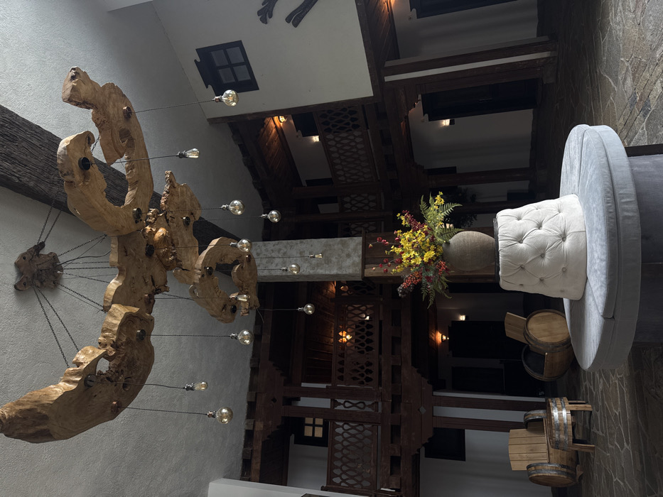The image depicts the interior atrium or courtyard of a building in Krasnovo, Bulgaria. A prominent, large chandelier fashioned from irregular, light-colored wooden planks or burls is suspended from the white ceiling by metal chains. Multiple bare Edison-style light bulbs hang from the chandelier at varying lengths. The space features multi-level wooden architecture with dark brown beams, columns, and intricately carved or patterned railings forming balconies and walkways. Walls behind the wooden structures are predominantly white or light-colored, with several dark-framed rectangular windows visible on upper levels. Multiple dark-colored doors, some with wall-mounted sconces, are present on both ground and upper levels. The floor is paved with irregular-shaped flagstones or cobblestones. In the foreground, a circular grey upholstered bench with a central tufted, off-white upholstered structure is visible. On this central structure, a rustic-style ceramic vase holds an arrangement of yellow flowers, red berries, and green foliage. To the left, two chairs and a small table, all constructed from repurposed wooden barrels, are positioned. One chair features a wooden backrest. No individuals are present in the scene.