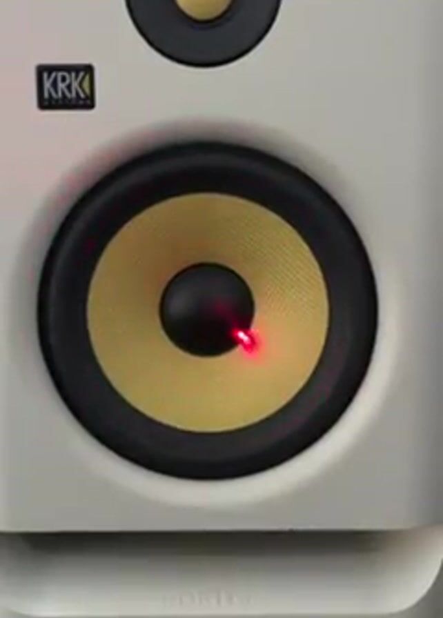 close-up shot of a KRK Rokit 7 studio monitor speaker. The speaker cabinet is off-white. The speaker cone is yellow with a black dust cap and surround. The tweeter is black with a gold-colored center. A red laser light is shone on the speaker cone, creating a rotating light pattern that moves and pulses with the sound.