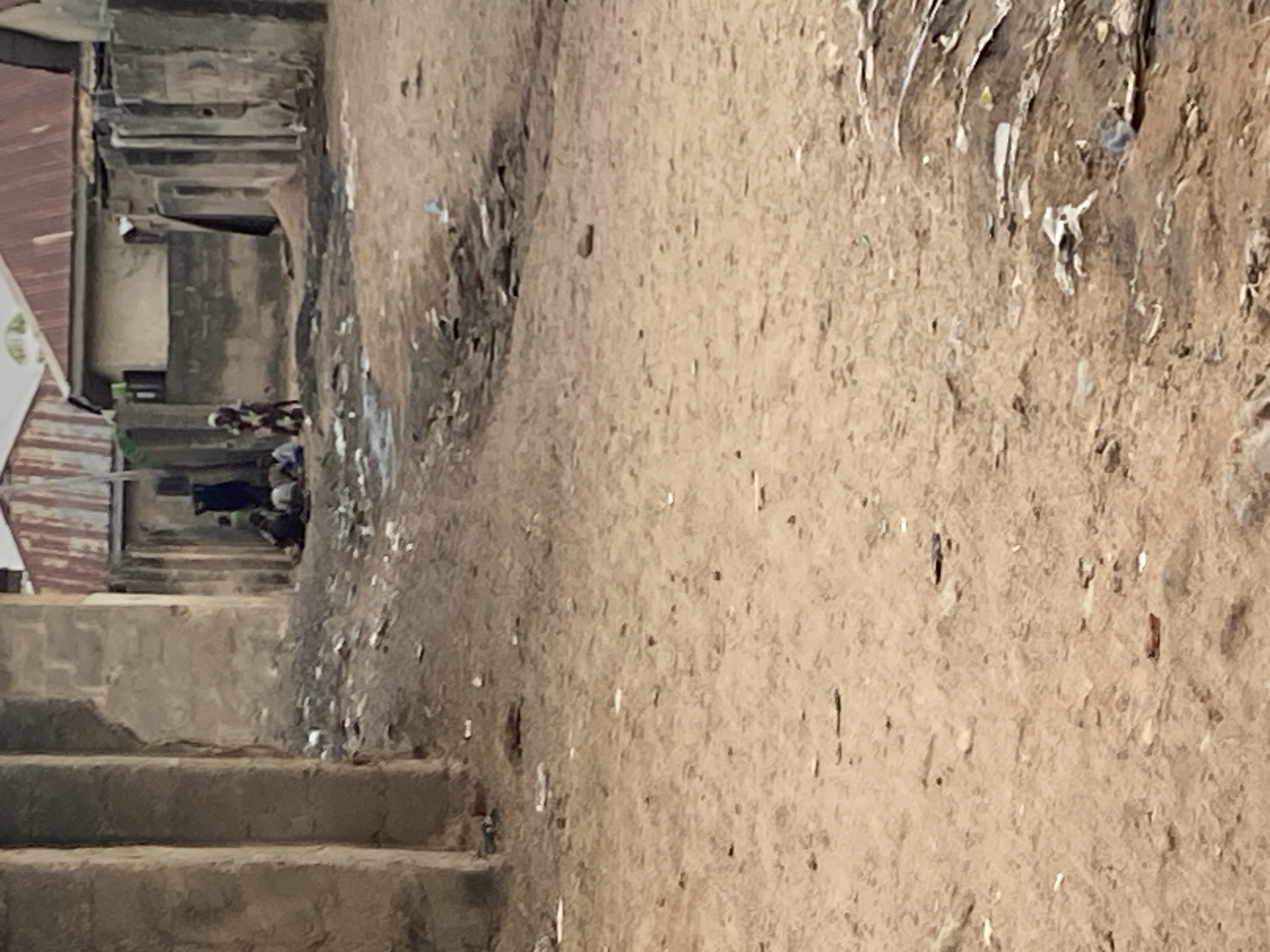 A tilted medium-shot image shows a set of weathered concrete stairs leading downward into what appears to be an alleyway or narrow street in a built-up area. The area is dusty with scattered debris. A few figures are visible in the background of the alleyway. The setting appears to be a densely populated area in Minna, Nigeria.