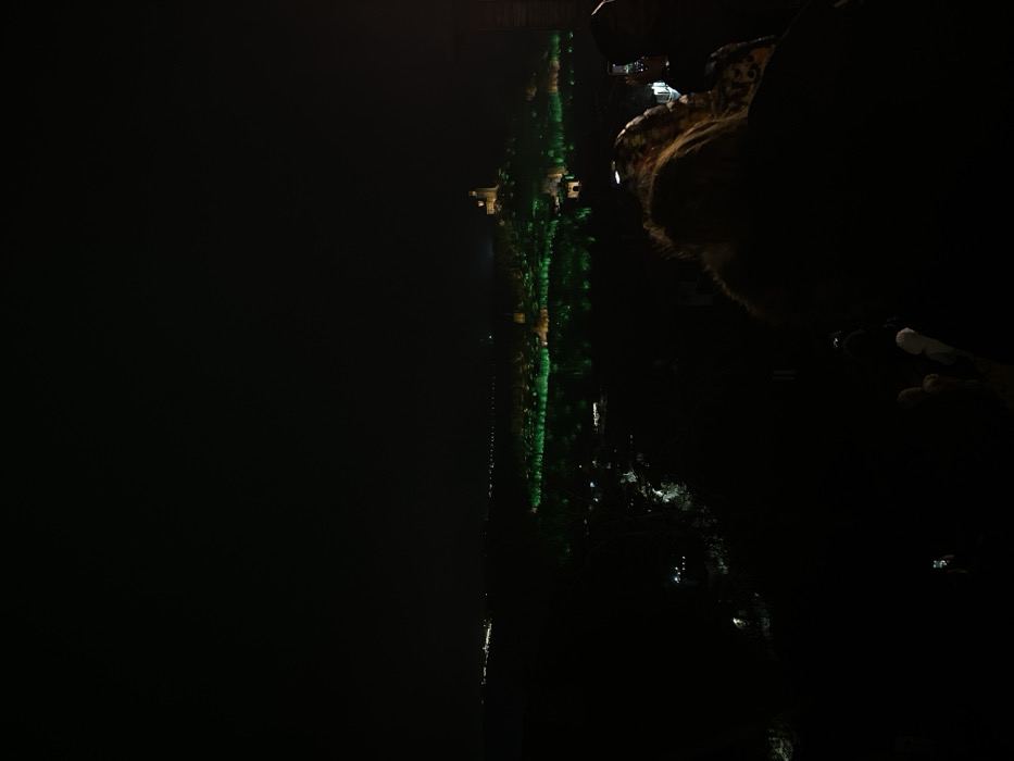 This nighttime image captures a panoramic view of Tsarevets Fortress in Veliko Tarnovo, Bulgaria, from an elevated vantage point. The fortress, situated on a hill, is illuminated, with its lower ramparts and surrounding vegetation bathed in green light, while the Patriarchal Cathedral at the summit glows with golden-white illumination. In the foreground, the silhouettes of several individuals are visible. At least two individuals on the right are holding up smartphones, indicating they are either photographing or video recording the illuminated scene. The sky above is dark, and faint scattered lights from the wider city landscape are discernible on the distant horizon, suggesting a sprawling urban environment beyond the fortress.