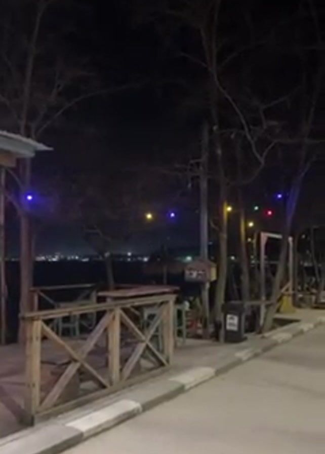 The scene is captured at night, presenting a tranquil outdoor space illuminated by a string of colorful lights. The string features blue, yellow, and red bulbs. Along a paved walkway are bare-branched trees positioned between the walkway and a wooden fence that fronts a patio area. On the patio are tables, suggesting a dining or recreational area. In the background, the distant lights of a city stretch across the horizon. A trash receptacle is visible between the trees, near the walkway. The sky is a dark, inky black, adding to the nighttime atmosphere.