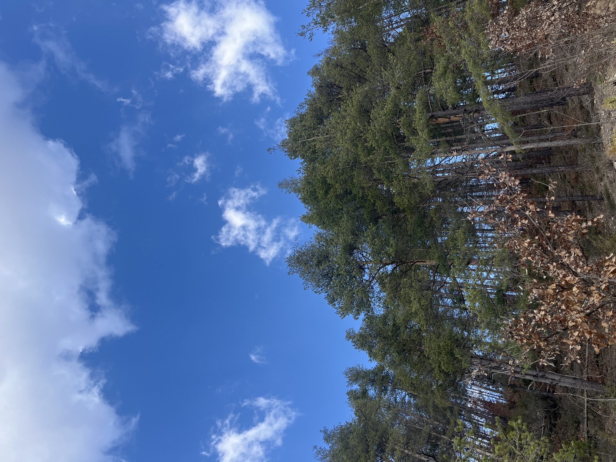 The image displays a dense forest on a hillside in Srednogortsi, Bulgaria, under a bright blue sky. Scattered white cumulus clouds are visible across the upper two-thirds of the frame. The lower third is occupied by numerous tall evergreen trees with dark green needle foliage. In the foreground and lower mid-ground, deciduous shrubs with dry, light brown leaves are present. The terrain exhibits an upward slope covered with natural ground and undergrowth. No individuals, animals, or artificial structures are visible. The scene is illuminated by natural daylight.