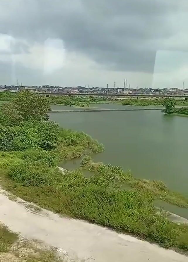The video presents a medium-shot view of a body of murky water, possibly a lake or a bay, under a cloudy sky. The water is surrounded by dense green vegetation along the shoreline, creating a natural border. In the distance, a cityscape with buildings and infrastructure like bridges or overpasses can be seen. The vantage point is likely from a slightly elevated position, possibly inside a vehicle, as suggested by window reflections in the upper portion of the frame.