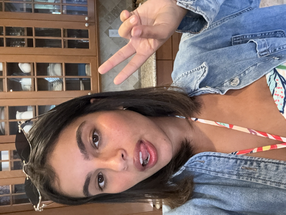 A young woman is depicted in a selfie-style portrait, positioned indoors within what appears to be a residential kitchen. She has dark, shoulder-length hair, with black sunglasses resting atop her head. She wears a light blue denim jacket over a low-cut, multicolored patterned top. Her gaze is directed at the camera, her mouth is slightly open with her tongue extended to touch her upper lip. Her right hand is raised to the right of her face, displaying a peace sign (V-sign) with her index and middle fingers extended. The background features medium-brown wooden kitchen cabinets equipped with glass panel doors, through which various white ceramic dishes, plates, and pitchers are visible on shelves. A light-colored, possibly granite or quartz, countertop is visible beneath the cabinets, and a white electrical outlet is mounted on the wall to the right.