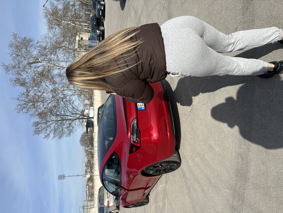The scene is an outdoor parking area in Ruse, Bulgaria, under a clear blue sky. A single individual, viewed from behind, occupies the foreground. This individual has long, light brown hair with blonde highlights, wears a dark brown puffer jacket, light grey sweatpants, and black athletic shoes. They are in a slightly crouched posture, holding a dark-colored smartphone horizontally, aiming it towards a red Tesla Model 3. The red Tesla Model 3 is parked on an asphalt surface, with its driver's side door partially open. Its rear license plate, clearly visible, is Bulgarian and reads "E 0202 BG". The car is equipped with black wheels. In the background, beyond the Tesla, several other vehicles are parked. To the left, a silver sedan is visible. To the right, multiple dark-colored SUVs and crossovers are parked, including what appears to be a Citroen C4 Cactus. Further in the distance, bare-branched deciduous trees and distant city buildings are visible. A prominent structure with stadium floodlights is present on the far left horizon, indicating proximity to a sports complex like the Ruse City Stadium. A distinct shadow of the photographer is cast on the asphalt to the left of the foreground individual.