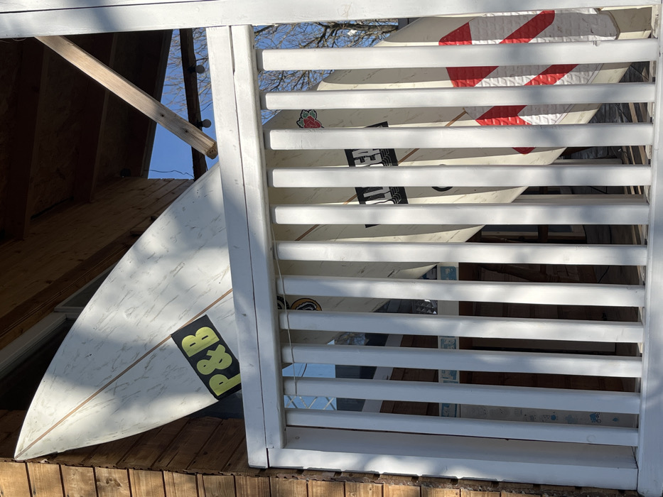 The scene in Pchelnik, Bulgaria, depicts a collection of surfboards positioned upright behind a white wooden railing, illuminated by strong sunlight