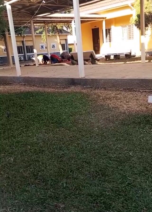 Several people are praying under a covered walkway or shelter, kneeling on the ground with their heads bowed down. They are located in an outdoor area with green grass in the foreground and buildings with yellow exteriors and white trim in the background. The shelter has a metal frame and a translucent roof, providing shade.