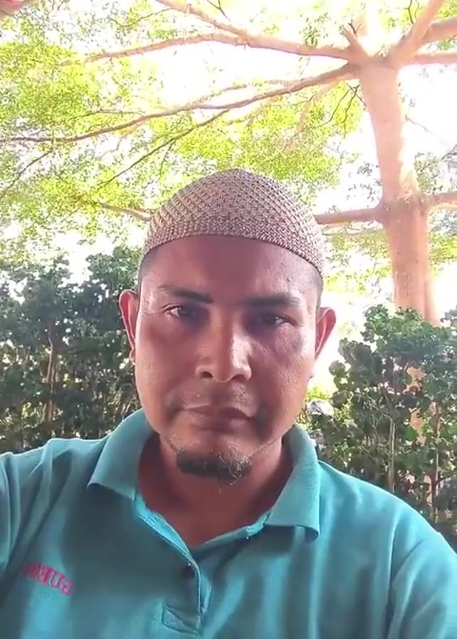 A medium shot depicts a man with a tan complexion, wearing a crocheted skullcap and a teal polo shirt, looking directly at the camera. He has a short beard, and his expression is neutral. Behind him, the foliage of a leafy tree and shrubbery provide a backdrop. The lighting suggests it's daytime, and the scene appears to be outdoors under a partially shaded area, possibly a porch or similar structure.