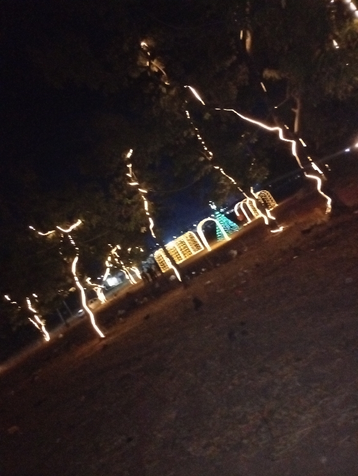 A night scene depicts trees illuminated with strings of white lights, creating a festive ambiance. The lights zigzag along branches, contrasting with the dark foliage. In the background, a structure is adorned with yellow and blue lights, likely for an event or holiday. The foreground is a shadowy, textured surface, possibly a path or road. The overall perspective is tilted, adding to the dynamic feel of the nighttime display.