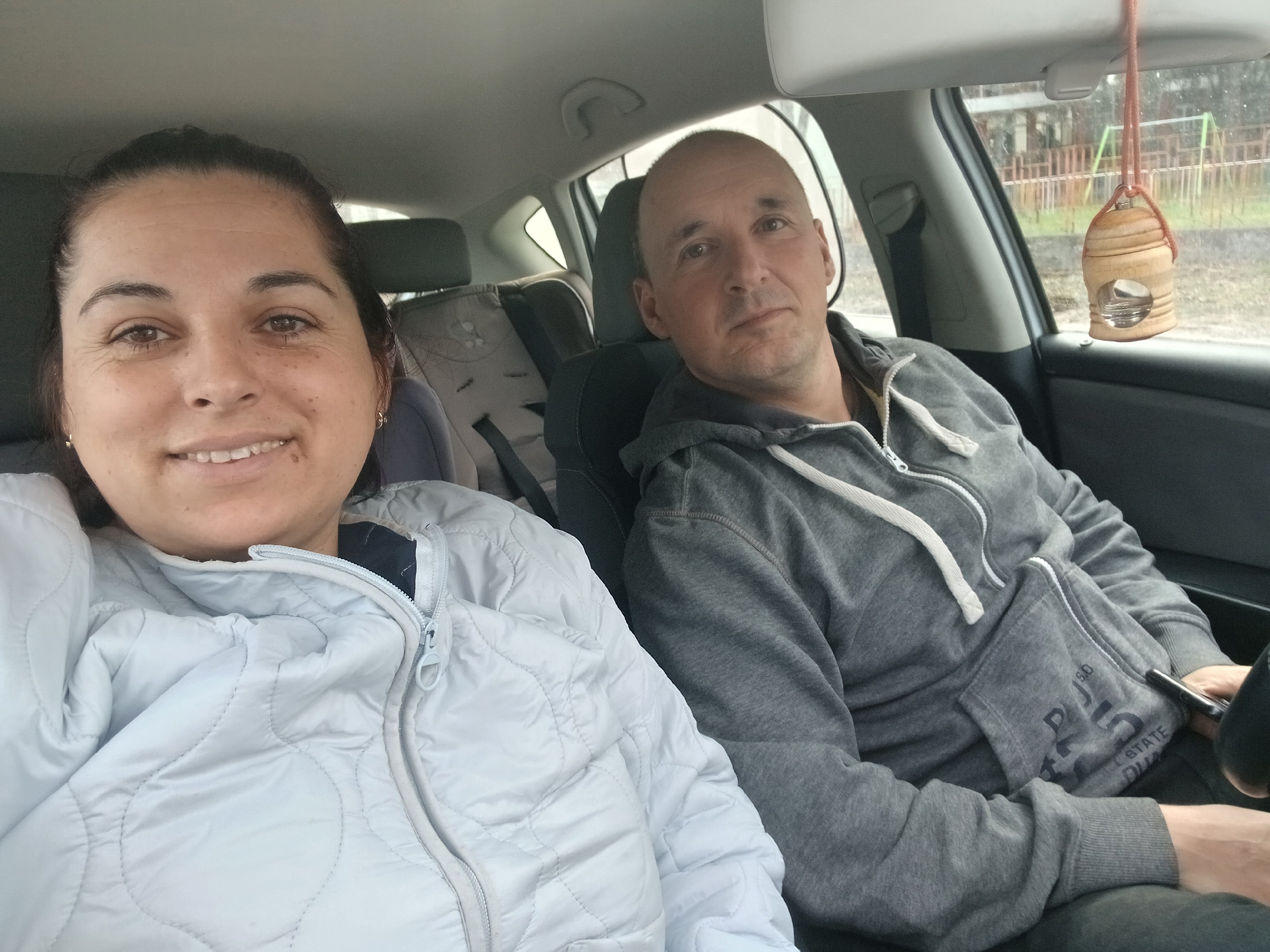 Inside a car, two individuals are visible. A woman with dark hair, wearing a light blue quilted jacket, sits on the left, smiling. A man, with a shaved head and wearing a gray hooded sweatshirt, is on the right. He looks towards the camera with a neutral expression. A wooden air freshener hangs from the rearview mirror. Outside the car window, there's a view of an outdoor playground. The image was taken in the city of Dobrich, Bulgaria.