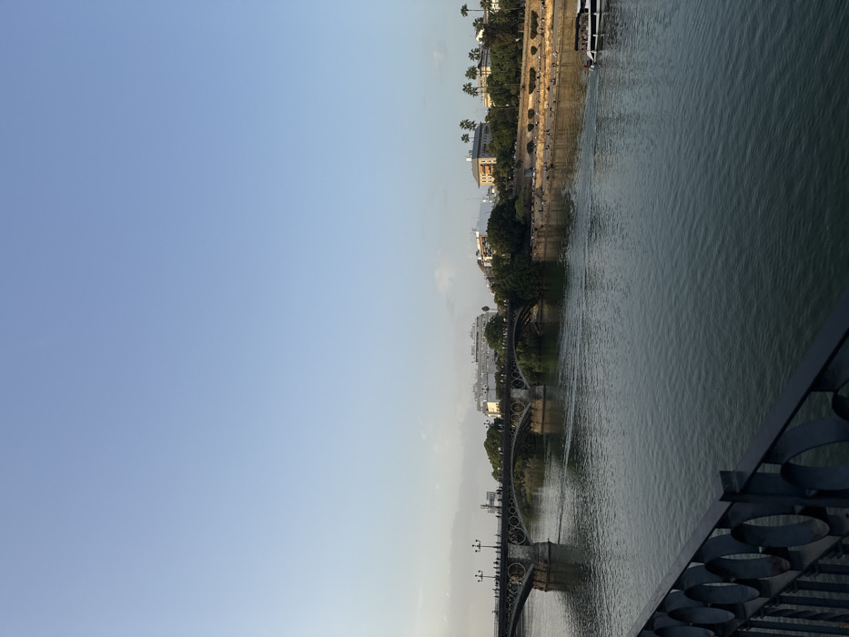 The image captures the Puente de Isabel II (Triana Bridge) crossing the Guadalquivir River in Seville, Spain. A dark metal railing with circular patterns is visible in the lower left foreground. The river occupies the central and lower portions of the frame, displaying dark green water. A white, multi-decked tour boat is positioned on the right side of the river, moving rightward and creating a wake. The iron bridge, a prominent feature, extends across the river, supported by stone piers and featuring multiple arches with decorative lampposts and numerous pedestrians visible on its deck. The far riverbank reveals a stepped, light-colored promenade populated by scattered individuals, some seated. Beyond the promenade, a dense line of trees, including numerous palm trees, precedes a series of multi-story urban buildings. The sky above is clear and pale blue, indicating daytime conditions.