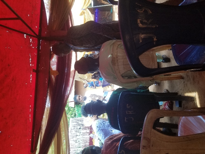 The image depicts an outdoor social gathering in Ochadam, Nigeria, viewed from a low angle