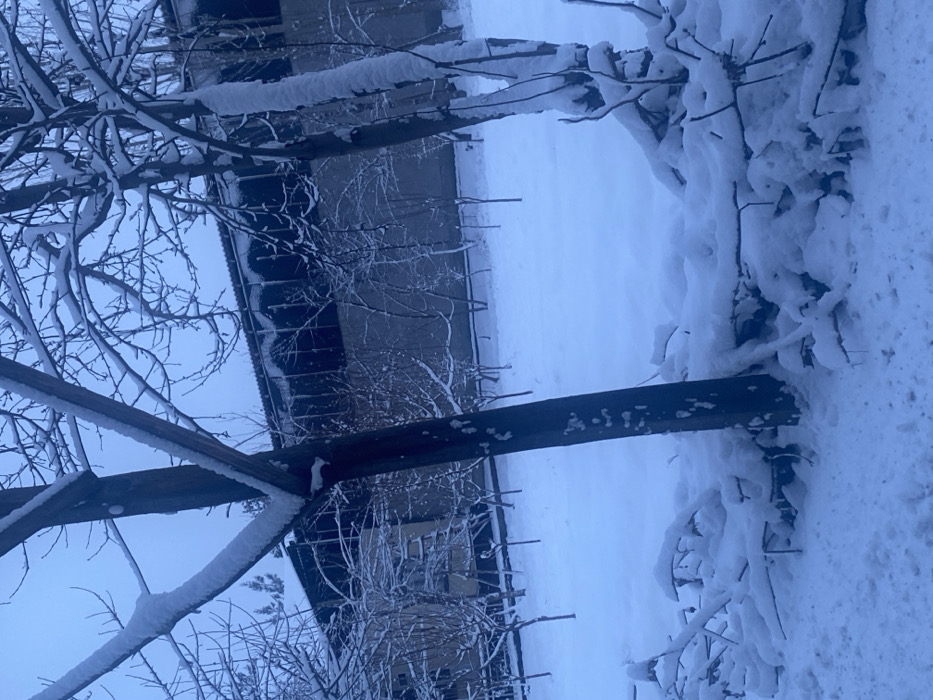 A winter landscape with snow-covered ground and trees. A building is visible in the background, its roof and structure also covered in snow. The foreground features branches coated with snow, creating a dense, textured pattern. The overall scene is dominated by shades of white and blue, conveying the cold and serene atmosphere of a snow-covered day.