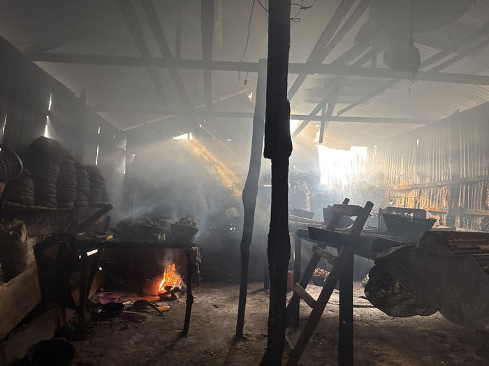 This image depicts the smoke-filled interior of a processing facility, likely a smokehouse, in Limbe, Cameroon