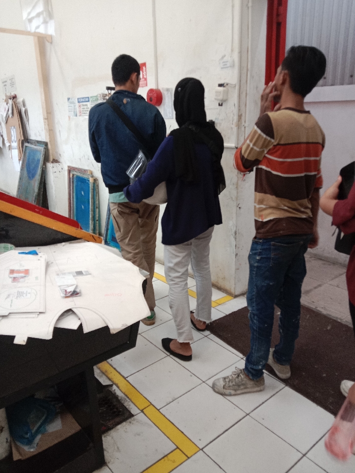 A group of people stands in a room, possibly a workshop. A man in a blue denim jacket and khaki pants is facing a wall with screens. Next to him, a woman in a hijab carries a white bowl. A man in a striped shirt and blue jeans stands to the right, talking on the phone. Another person stands partially visible to the right. A worktable with paper patterns is in the foreground. The floor is tiled with yellow safety lines.