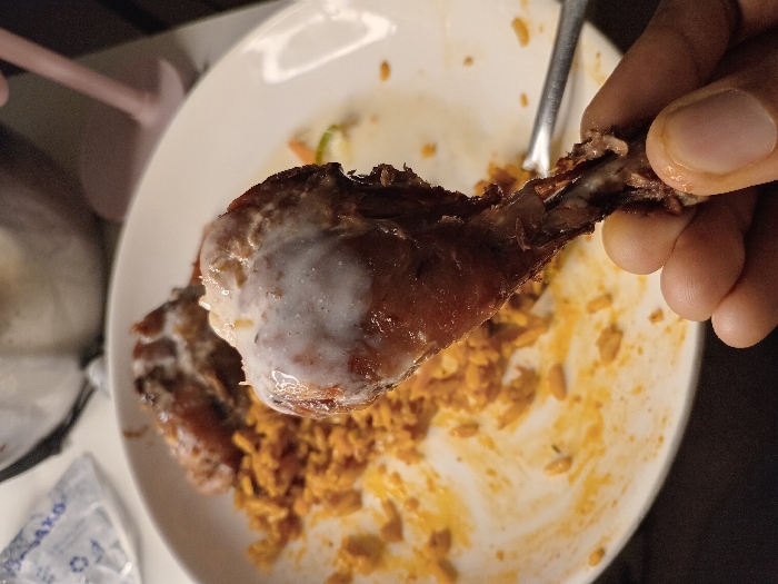 A partly eaten plate of food features a drumstick being held in a hand. The drumstick is coated in a white, creamy sauce and has been partially consumed, revealing the bone. Yellow rice is visible on the plate, along with remnants of sauce. A fork rests on the plate. Part of a small white packet sits at the bottom left of the image.