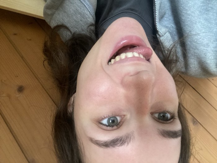 The image is a close-up, informal portrait of a young adult female indoors. The subject's face occupies the majority of the frame, displaying a broad smile with her tongue extended from her mouth, revealing her upper dentition. She has fair skin, light-colored eyes, and dark, wavy hair partially visible on the right side of the image. Her eyebrows are dark and full. She is dressed in a grey hooded zippered sweatshirt layered over a dark, round-neck shirt. The background features light-brown, horizontally paneled wooden walls or ceiling, indicative of an interior space. A lighter-toned wooden beam or surface is partially visible along the bottom right edge. The image provides no visual identifiers to corroborate the specified location in Glattbrugg, Switzerland.