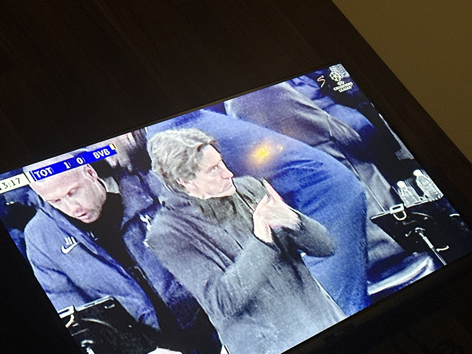 This image, captured in Uyo, Nigeria, displays a photograph of a television screen at an oblique angle. The screen shows a live broadcast of a football match, with a digital overlay indicating a score of "TOT 1 0 BVB" and a timestamp of "13:17." The "CHAMPIONS LEAGUE" logo is visible in the lower right corner of the broadcast. Two adult males are depicted on the screen. The man in the upper-left segment has a shaved head, a light beard, and wears a blue jacket with a white Nike logo on the left chest. He is looking to his left, appearing to observe the match. The second man, positioned below and slightly to the right of the first, has light brown, wavy hair and wears a dark grey long-sleeved shirt. He is looking down intently at a mobile device held in his hands, from which a distinct yellow-orange light emanates onto his blue-clad leg, consistent with a smartphone screen. In the lower-left area of the broadcast image, two transparent plastic bottles and some black lanyards or straps are visible on a dark surface. The individuals on screen appear to be seated, likely in a stadium or event setting.