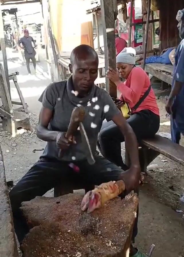 A man sitting on a tree stump is seen using a hammer and chisel to process animal feet. He is wearing a gray shirt with white dots and black pants. He raises the hammer and strikes the chisel on the animal feet, which are on the stump. There is a woman sitting on a wooden bench behind him, looking at a phone. Other people can be seen passing in the background. The scene appears to be outdoors, with a makeshift structure overhead. A green sandal is lying on the ground next to the stump.