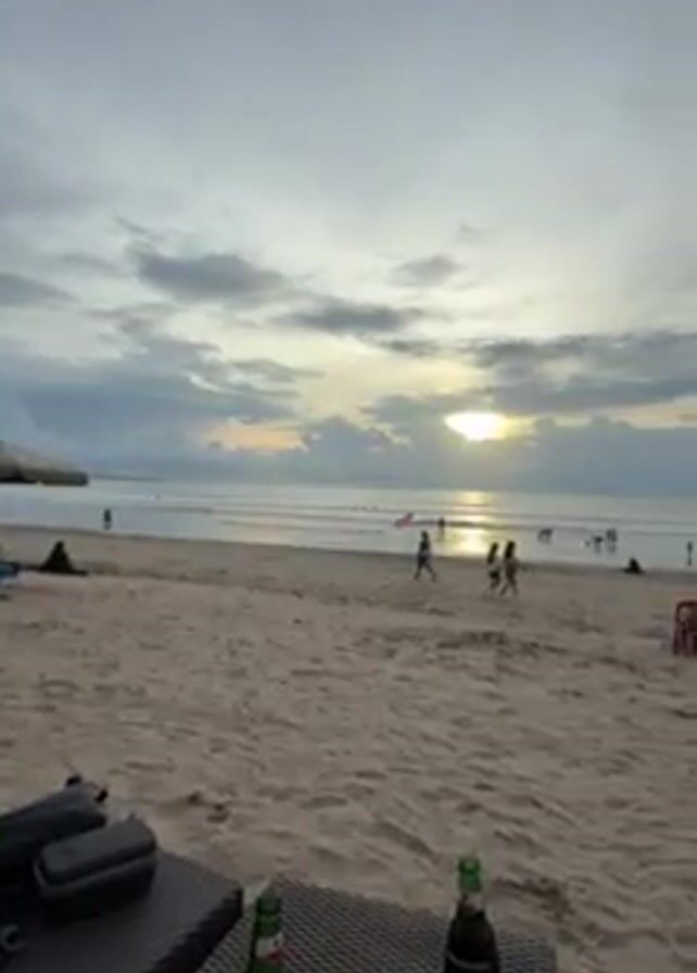 beach scene at sunset. People are walking and playing on the sand. There are lounge chairs and umbrellas on the beach. Two bottles of beer are on a table in the foreground. The sky is cloudy with the sun breaking through.