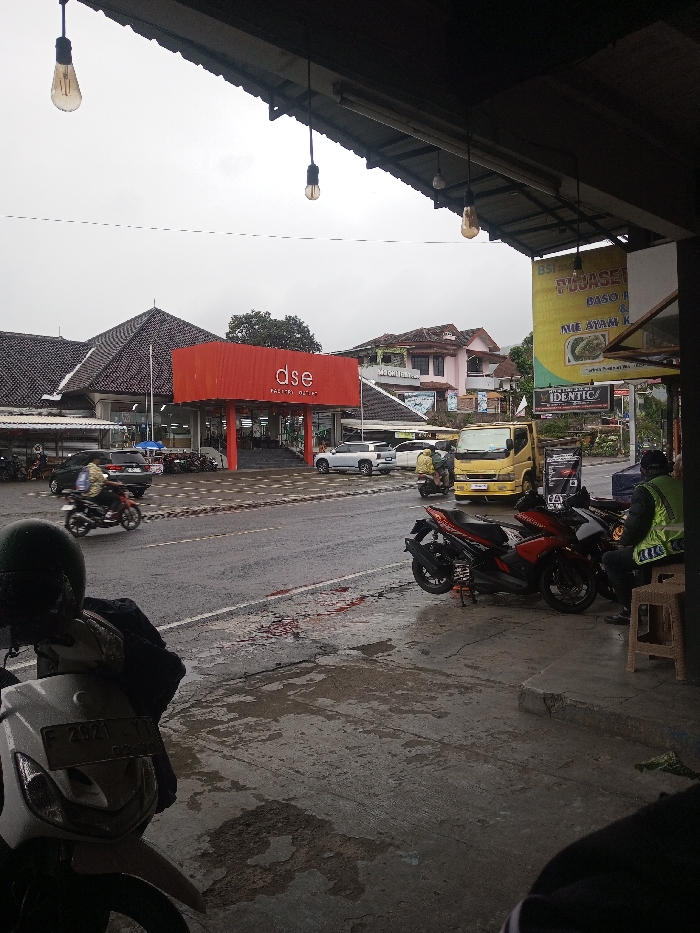 A street scene shows a motorcycle parked in the foreground, with others lined up alongside. Across the street, a red-roofed building with the letters "dse" marks an entrance. A yellow truck and other vehicles are visible on the wet road. A poster displaying food and the word "Identics" hangs nearby. The sky is overcast, and hanging lightbulbs cast a dim glow from the shelter above.