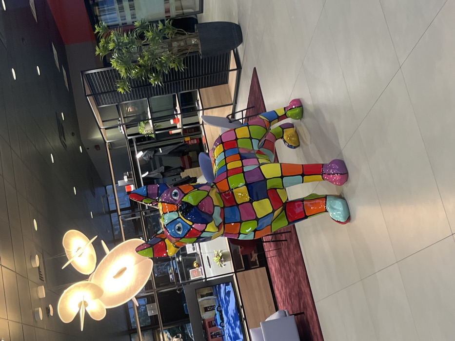 An eye-level, slightly angled interior shot depicts a large, polychromatic sculpture of a French Bulldog standing centrally on a light grey tiled floor