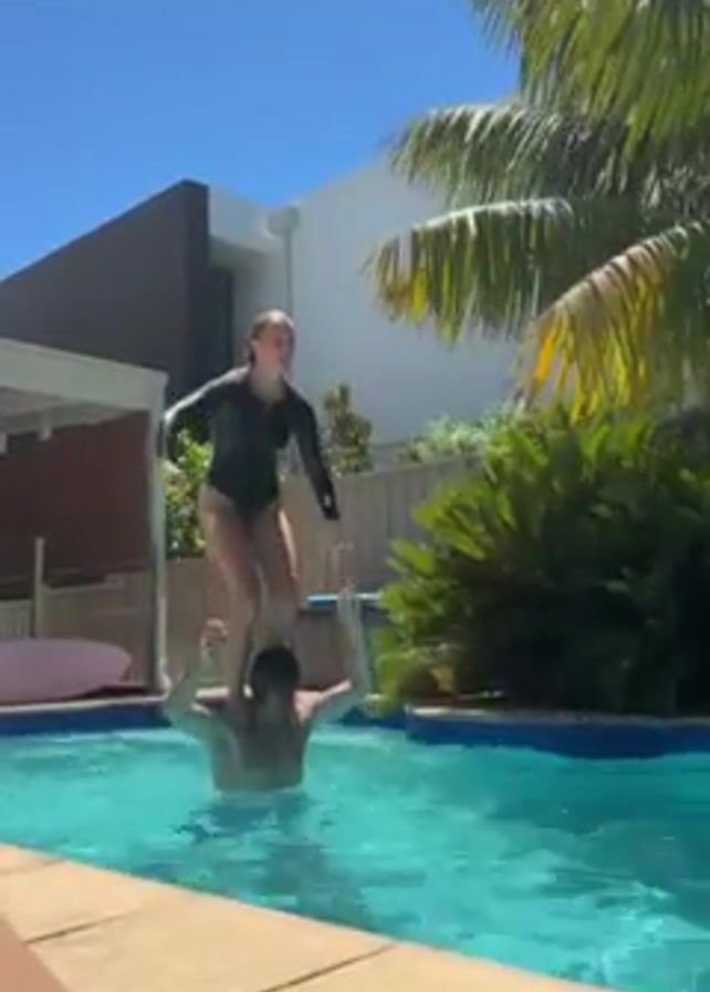 A young woman in a black swimsuit and rash guard performs a backflip off the shoulders of a man in a swimming pool. The man is standing chest-deep in the turquoise water. They are in a backyard with a modern house visible behind them. A tall palm tree stands to the right of the pool. The sky is a clear blue. The camera is stationary and close to the edge of the pool.