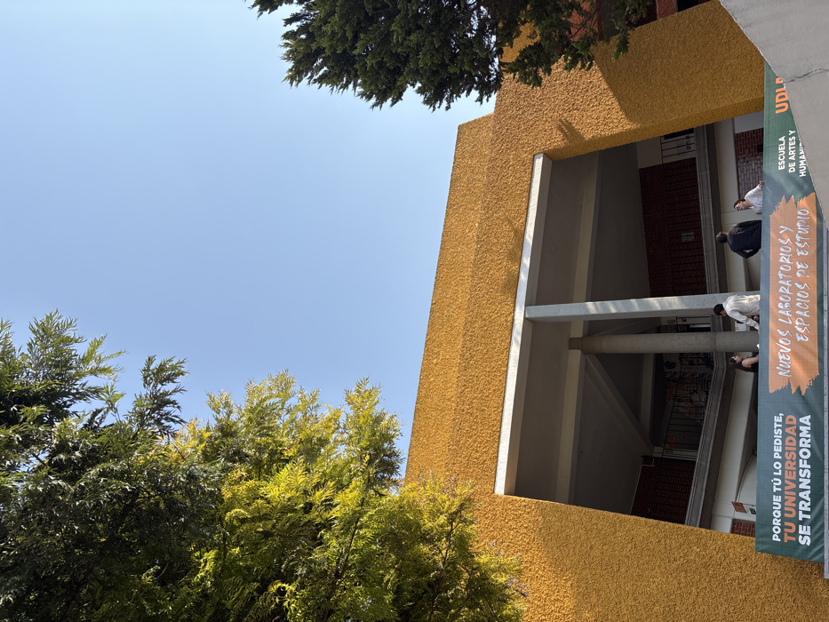 An upward-angled view shows a yellow-walled building with a rectangular opening revealing its inner structure, including columns and multiple floors. People are visible inside the building. A banner with the Spanish text "PORQUE TÚ LO PEDISTE, TU UNIVERSIDAD SE TRANSFORMA NUEVOS LABORATORIOS Y ESPACIOS DE ESTUPIO ESCUELA DE ARTES Y HUMANI UDLA" hangs on the building's facade. Trees with varying shades of green foliage frame the building against a clear blue sky.