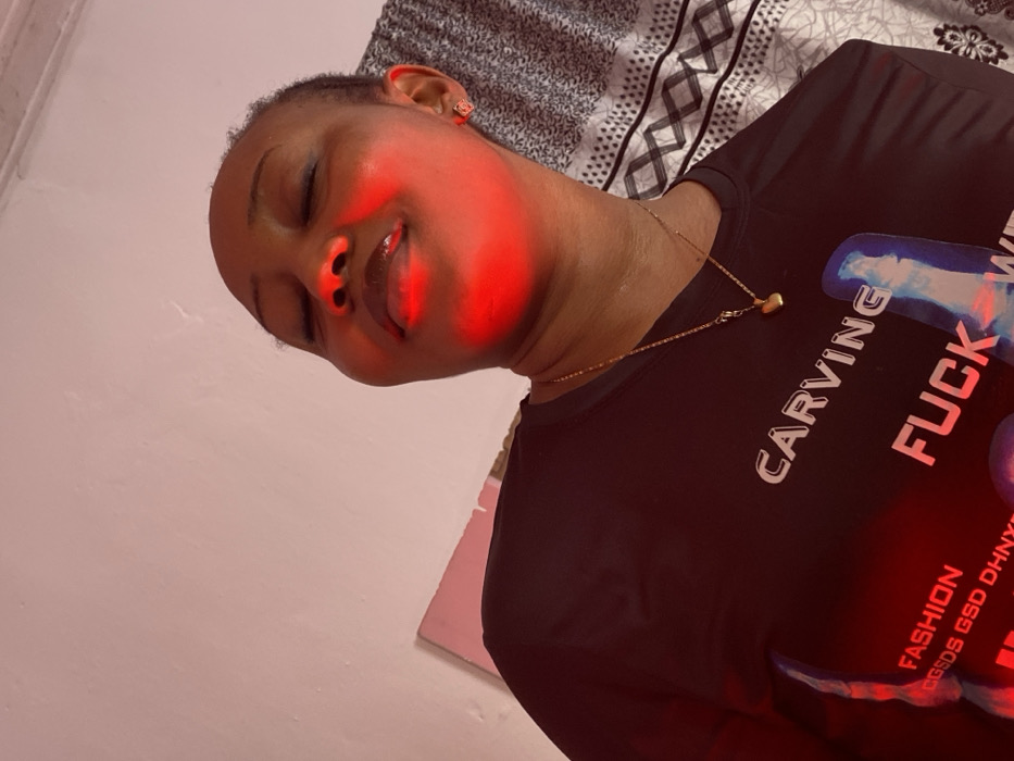 A dark-skinned person with short hair wears a black t-shirt with white lettering and a graphic design on it. The person is angled to the side with closed eyes and a slight smile. Their face is illuminated with a strong red light. They are wearing a gold necklace with a heart pendant. A white patterned blanket is visible in the upper right corner, and a pale pink wall is in the background.