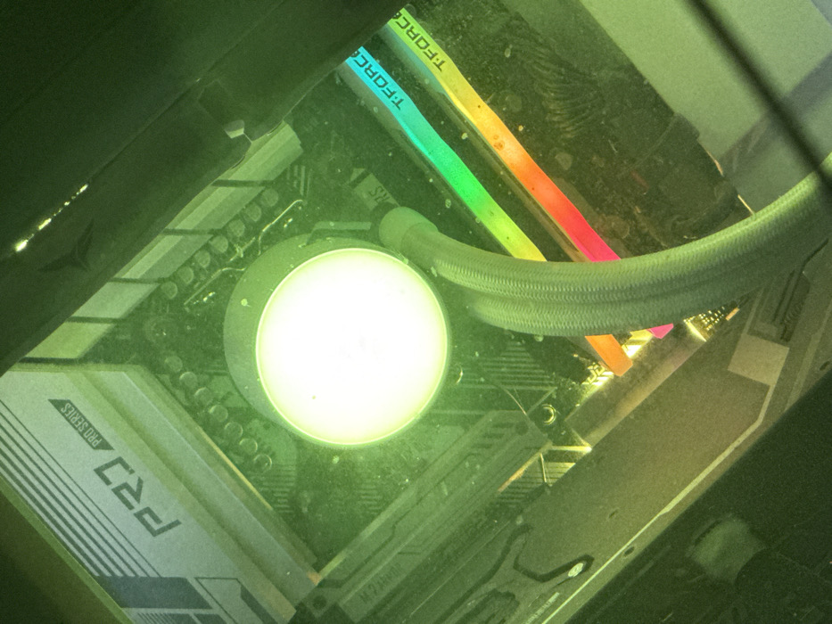The image displays an internal view of a desktop computer case, photographed from an elevated angle looking downwards into the system's interior. A dominant green hue permeates the scene, likely originating from internal RGB lighting, and substantial dust accumulation is visible on surfaces and within the air, along with fingerprint smudges on what appears to be a transparent side panel in the foreground and lower-right quadrant. Centrally located is a circular, brightly illuminated white component, identified as the pump/cold plate assembly of an All-in-One (AIO) liquid CPU cooler, secured to a motherboard. Two braided hoses extend downwards and to the right from this pump, carrying coolant. To the upper left of the pump, a metallic heatsink or I/O shroud is visible on the motherboard, bearing the text "PRJ" and "PRO SERIES," indicative of an MSI PRO series motherboard. To the right of the AIO hoses, two sticks of RAM (Random Access Memory) are installed, featuring active RGB lighting that displays a gradient of colors from blue-green to yellow-orange-red. The brand "T-FORCE" is clearly legible on these RAM modules. Various other motherboard components, circuitry, and mounting hardware are visible beneath the primary components. There are no individuals, explicit actions, or interactions depicted. The environment is confined to the interior of a computer chassis. The image provides no visual information regarding a specific geographical location, including Sofia, Bulgaria.