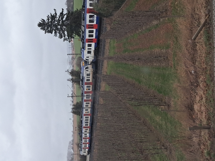 This image depicts a static, elevated view of a double-track railway line within the city of Ronnenberg, Lower Saxony, Germany, bordering an agricultural area. In the foreground, a cultivated field or orchard extends across the lower half of the frame, featuring numerous parallel rows of bare, leafless deciduous trees or vines planted on a gentle slope. Green grass grows between these rows, interspersed with patches of dry, brown vegetation. Two unpainted wooden posts are visible in the immediate lower foreground. The midground is dominated by the railway infrastructure. Two S-Bahn Hannover passenger trains are positioned on adjacent electrified tracks. Both trains feature a livery of white, blue, and red. The train on the left track consists of multiple carriages, with its front oriented towards the left. The train on the right track also comprises multiple carriages, with its front oriented towards the right; a clear graphic of a white bicycle on a blue circle is visible on the side of one of its carriages. Both trains appear stationary. Overhead catenary lines and their supporting structures are visible above the tracks. The background consists of expansive agricultural fields, displaying varying shades of green and brown. A prominent, tall, dark green coniferous tree stands to the right of the railway tracks. Scattered groups of leafless deciduous trees are also present. In the far distance to the left, several industrial or municipal structures, including a tall, slender white object, are discernible on the horizon. The environment is under a uniformly overcast, light gray sky, providing diffuse lighting. No human figures or active movement are depicted within the scene, suggesting a calm, possibly dormant, seasonal period (late autumn or winter).